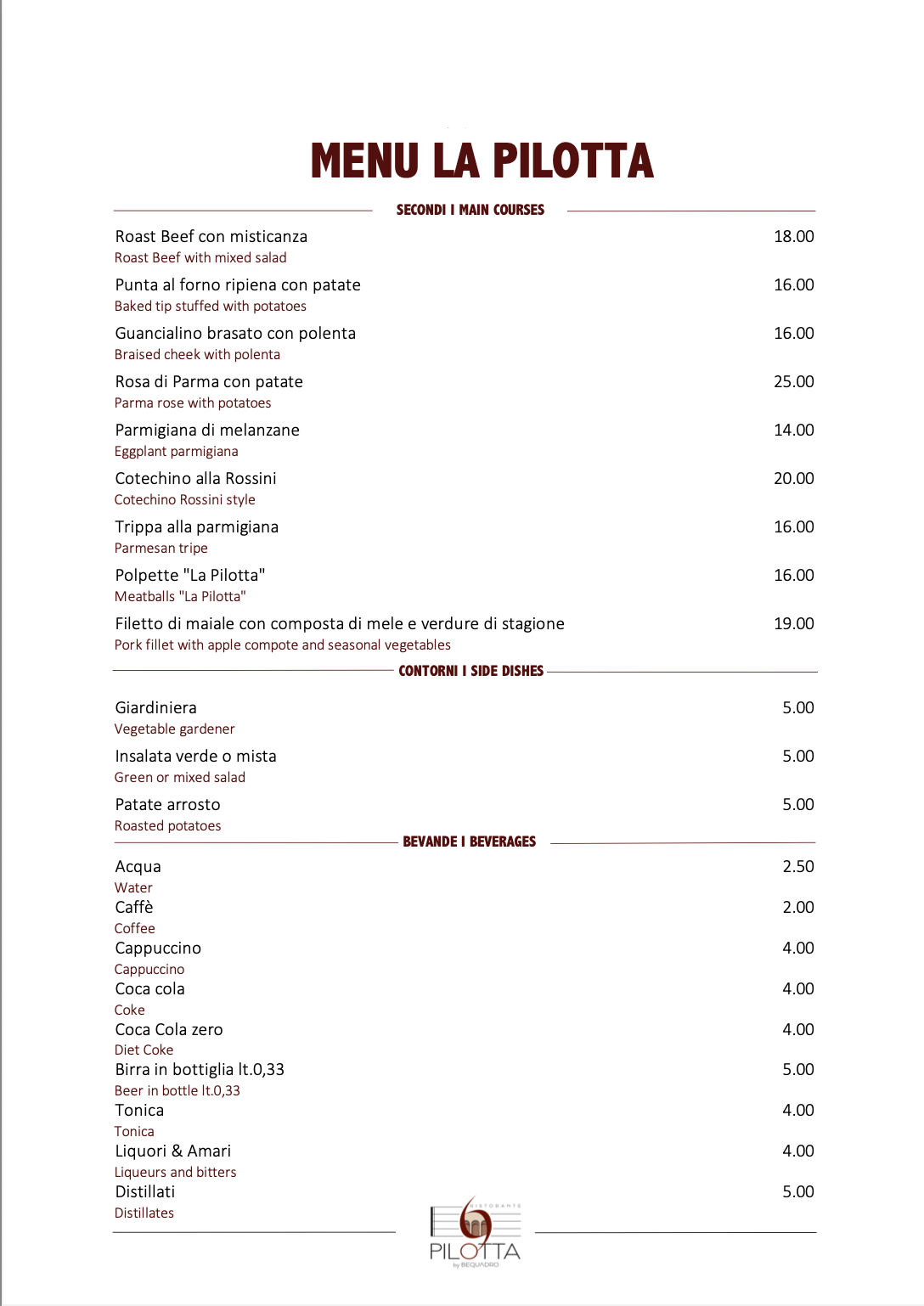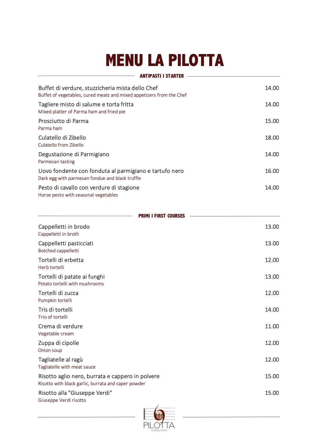 Il menu della Pilotta by Bequadro celebra la tradizione parmigiana con piatti preparati con ingredienti freschi e locali come i cappelletti fatti a mano e la punta al forno ripiena, accompagnati da un buon Lambrusco e il dolce tipico della città, la zuppa inglese.