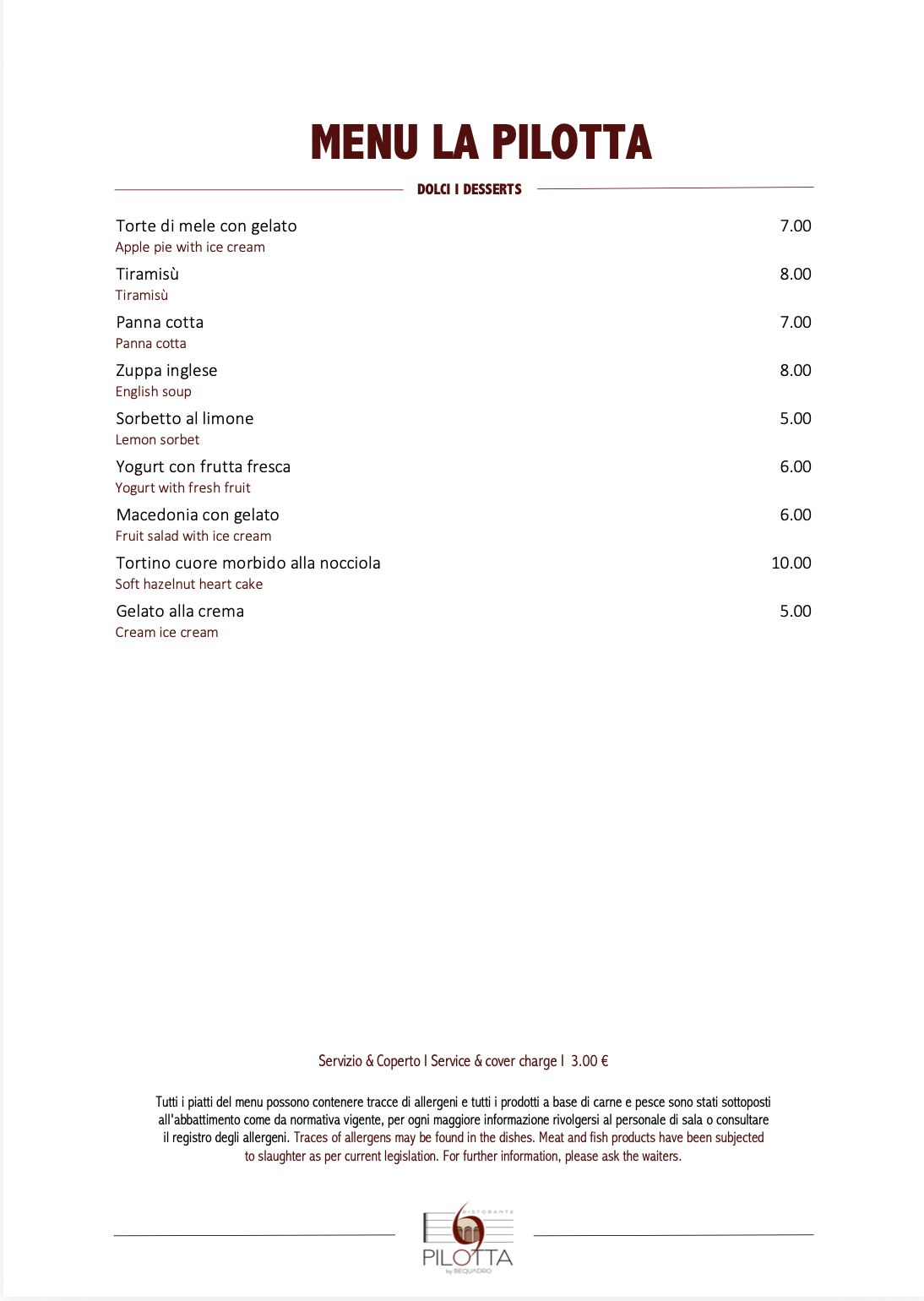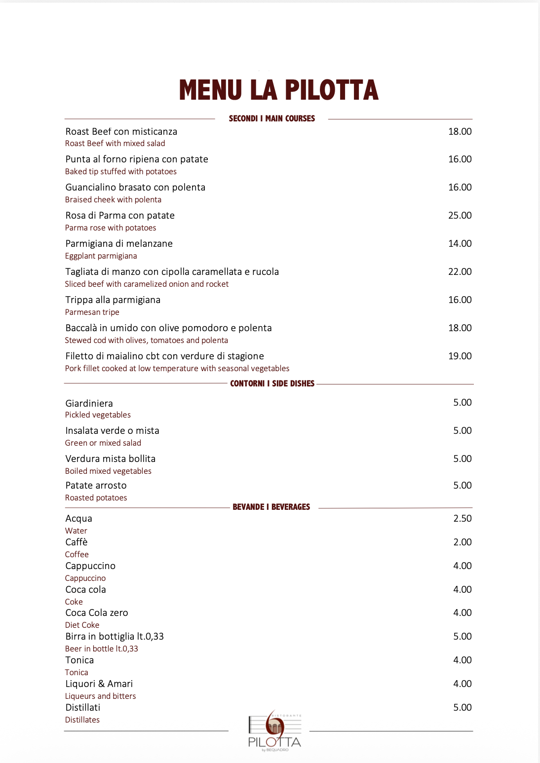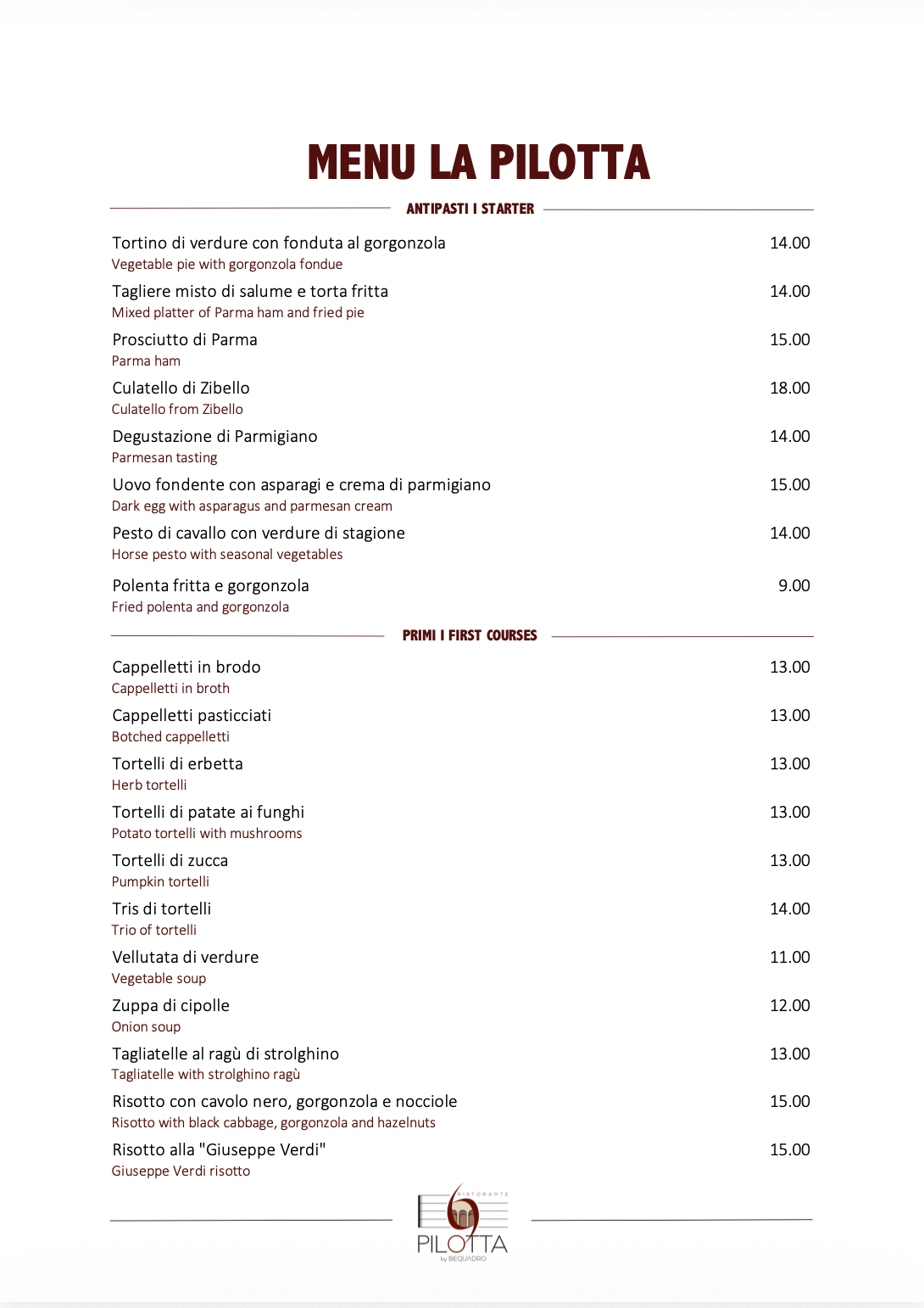 Il menu della Pilotta by Bequadro celebra la tradizione parmigiana con piatti preparati con ingredienti freschi e locali come i cappelletti fatti a mano e la punta al forno ripiena, accompagnati da un buon Lambrusco e il dolce tipico della città, la zuppa inglese.